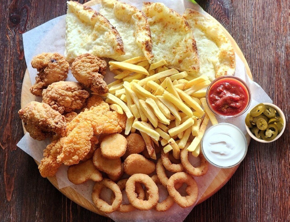 Острые куриные плечики, куриные стрипсы, куриные наггетсы, Хачапури по-мегрельски, луковые кольца, картофель фри, соус Сацебели, соус "Цезарь", халапеньо.