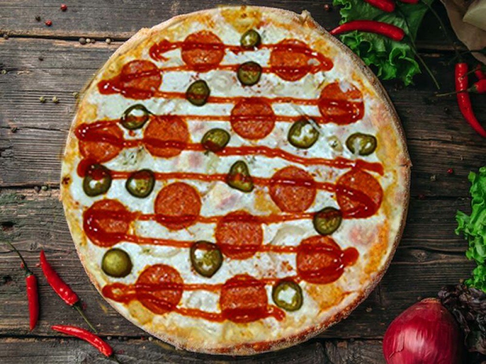 Тесто, соус чили, моцарелла, пепперони, перец халапеньо, маринованный лук, чесночное масло**. "ОСТОРОЖНО! ОЧЕНЬ ОСТРО!" **добавка