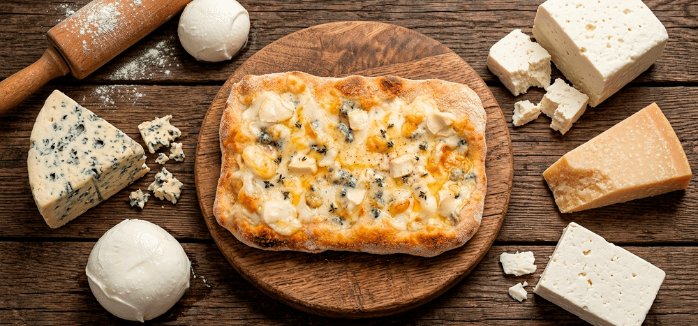Тесто для пинсы, сливочный соус, моцарелла, горгонзола, пармезан, фетакса и сливочный сыр. Изображение товаров на сайте может незначительно отличаться от оригинала продукции.