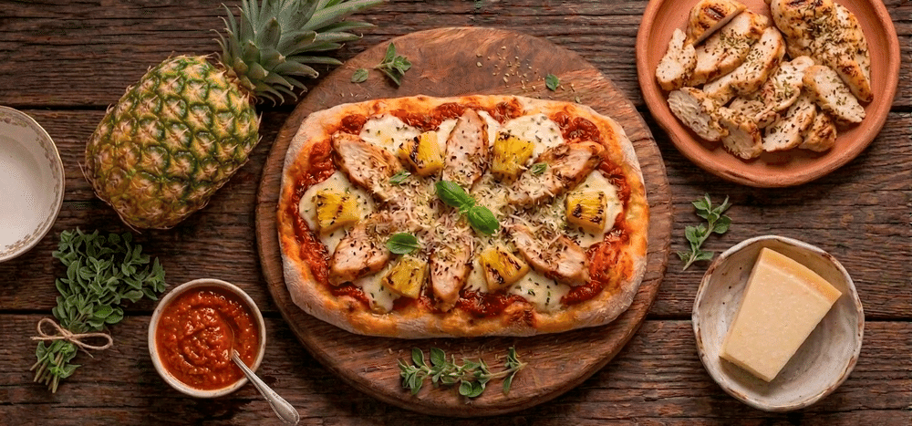 Тесто для пинсы, соус «Sugo del Papa», моцарелла, куриное филе, ананас, пармезан, орегано. Изображение товаров на сайте может незначительно отличаться от оригинала продукции.