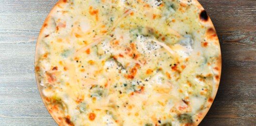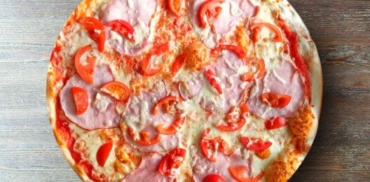 Тесто, соус томатный, моцарелла, сыр дор-блю, ветчина, грудинка копченая, чесночное масло**. **добавка Изображение товаров на сайте может незначительно отличаться от оригинала продукции.