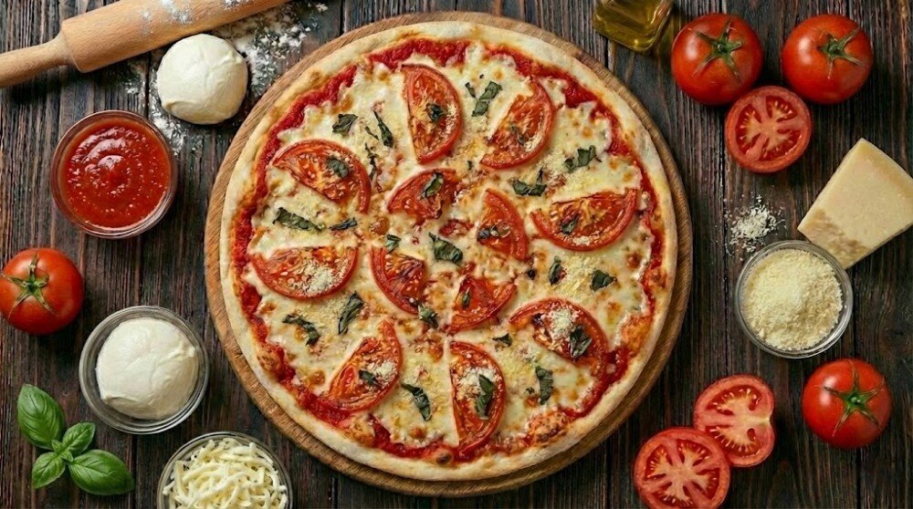 Тесто, соус томатный, моцарелла, пармезан, томаты свежие, чесночное масло**. **добавка Изображение товаров на сайте может незначительно отличаться от оригинала продукции.