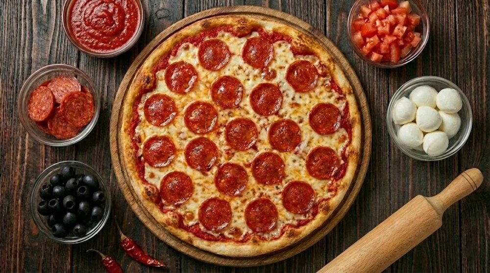 Тесто, соус томатный, колбаса с/к, маслины, томаты свежие, моцарелла, перец сладкий, чесночное масло**. **добавка Изображение товаров на сайте может незначительно отличаться от оригинала продукции.