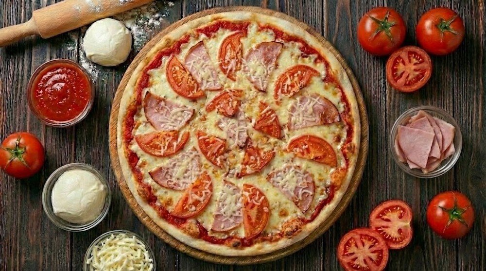 Тесто, томатный соус, ветчина, томаты свежие, моцарелла, чесночное масло**. **добавка Изображение товаров на сайте может незначительно отличаться от оригинала продукции.