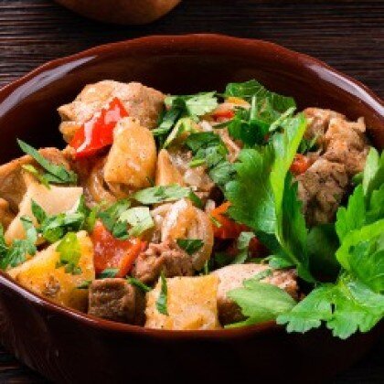Кусочки говядины тушеные со сладким перцем, чесноком, луком и зеленью. Изображение товаров на сайте может незначительно отличаться от оригинала продукции.